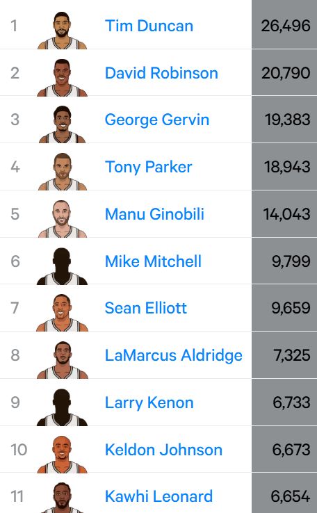 在得到这24分之后,凯尔登马刺生涯总得分达到6673分,超越伦纳德(6654分),升至队史第十,且距离前面第九的拉里肯农(6733分、马刺70年代名宿)也只差60分,不出意外的话,本赛季就能实现超越。