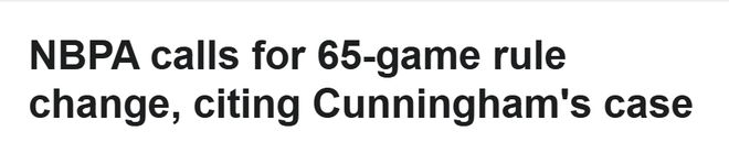 工会发言人声明:“坎宁安打出了生涯巅峰赛季,却可能因此无缘季后赛奖项,这显然是65场规则的一大弊端,也再次说明该规则必须废除,或针对重大伤病增设例外条款。自实施以来,已有太多本应获奖的球员,因这条武断、僵化的场次门槛被不公平地排除在赛季末荣誉之外。”