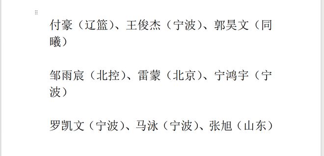 付豪(辽篮)、王俊杰(宁波)、郭昊文(同曦)、邹雨宸(北控)、雷蒙(北京)、宁鸿宇(宁波)、罗凯文(宁波)、马泳(宁波)、张旭(山东)