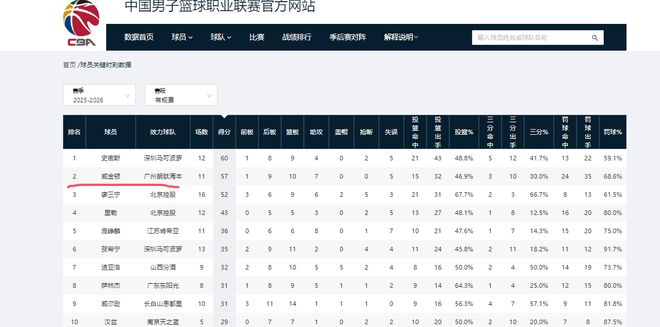 本赛季29次出场后,他场均可为广州队贡献22.8分6.8助攻4.4篮板,其中场均得分高居联盟第三,场均助攻高居联盟第一。