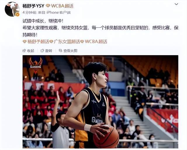 北京时间4月4日消息,2026年WCBA季后赛首轮,卫冕冠军广东女篮以总分0-2被江苏女篮横扫,遗憾止步一轮,爆出本赛季最大冷门。作为球队核心与新任中国女篮队长,杨舒予在赛后黯然落泪,承受着来自球迷、媒体与自我期待的多重压力。五天后,她终于在社交媒体上首次发声,以一句“试错中成长,继续冲!”回应外界关注,字里行间没有推诿,只有担当。