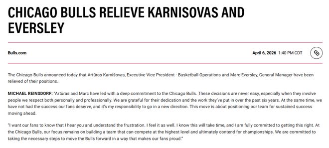 公牛队首席执行官兼总裁迈克尔-雷恩斯多夫发表声明称:“阿尔图拉斯和马克始终全心投入、倾力带领芝加哥公牛队。做出这样的决定从来都不容易,尤其是涉及到我们在个人和职业层面都十分敬重的人。我们由衷感谢他们过去六年来的付出与奉献。但与此同时,球队未能拿出球迷们理应期待的成绩,而我有责任带领球队开启新的方向。此次人事变动,旨在为球队未来的长期成功奠定基础。我想让球迷们知道,我听到了你们的声音,也理解大家的失望,我同样感同身受。我知道这需要时间,也会全力以赴把这件事做好。在芝加哥公牛,我们的目标始终是打造一支能在最高水平赛场竞争、最终冲击总冠军的球队。我们将采取一切必要措施推动公牛前进,不辜负球迷的骄傲与期待。”