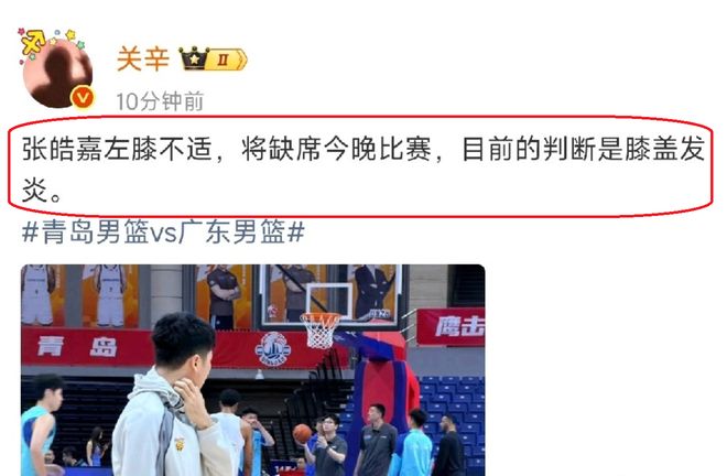 根据广东队随队记者关辛表示,张浩嘉因为左膝受伤,将会无缘与青岛队的比赛,根据了解,张浩嘉的膝盖出现了发炎,而且,还是比较严重。在赛前,张浩嘉也是没有参加训练,只是来到场边,给队友捡球。