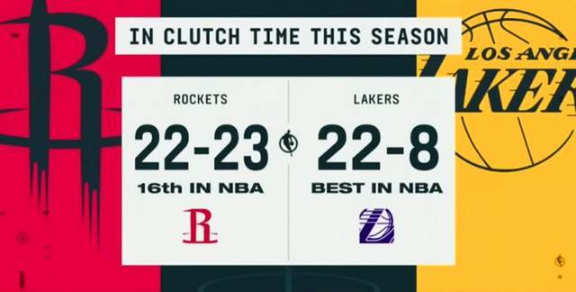 本赛季湖人历经关键时刻的比赛,战绩22胜8负,高居联盟第一;而火箭在关键时刻仅有22胜23负。