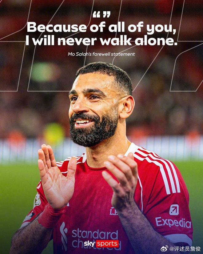 当萨拉赫在社交媒体上发布那段告别视频时,安菲尔德的世界仿佛静止了一瞬。“我将永远不会独行。”他用这句话作结,向这座陪伴他九年的城市,作最后的致意。虽然离开早已是必然,但当真正的离别时刻到来时,伤心难免,悲情难抑。