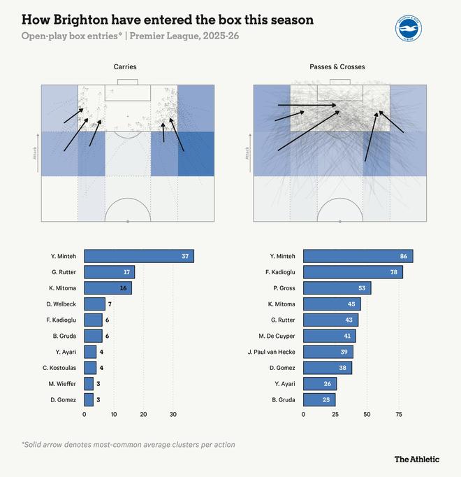 这位科特迪瓦国脚去年夏天才从莱加内斯转会至RB莱比锡,但已引起广泛关注。如上图所示,迪奥曼德非常喜欢盘带……非常频繁。在欧洲顶级联赛所有球员中,只有维克托-穆尼奥斯(奥萨苏纳)、维尼修斯(皇家马德里)和亚马尔(巴塞罗那)的过人次数比他更多——如下图所示,他能在两条边路都完成突破。