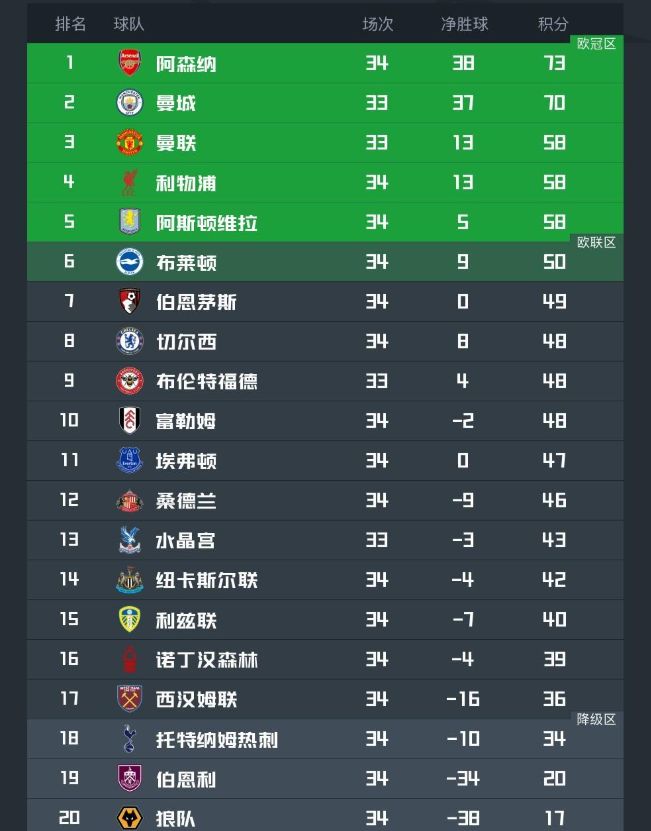 没有意外英超是本赛季五大联赛竞争最激烈的赛场,从第7轮开始领跑的阿森纳近期已经被曼城成功追上;虽说目前阿森纳34轮战罢积73分,但多赛1场才领先曼城3分;曼城70分少赛1轮且净胜球差距极小,仍掌握争冠主动权;近期抹平了9分的劣势更是让阿森纳承担着巨大的压力。