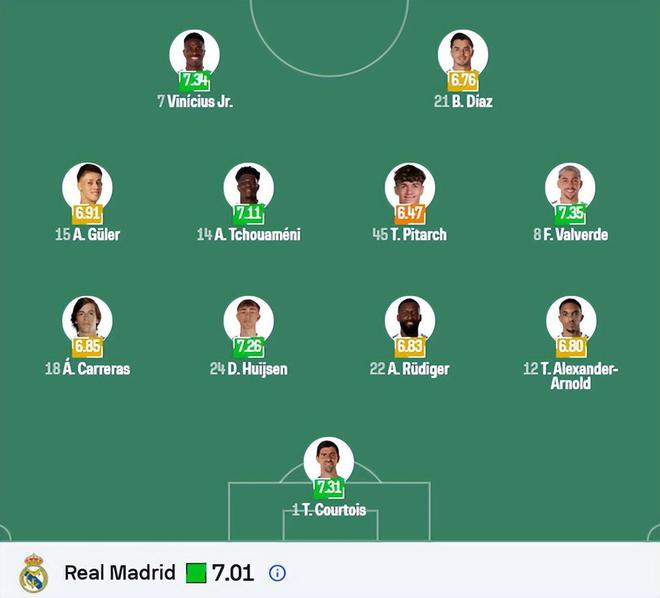 皇马(4-3-3):库尔图瓦;阿诺德、赫伊森、吕迪格、弗兰·加西亚;巴尔韦德、琼阿梅尼、卡马文加;布拉欣·迪亚斯、居莱尔、维尼修斯。米利唐、塞瓦略斯、罗德里戈、门迪、阿森西奥多名球员因伤缺阵。